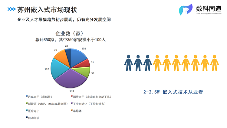 根据4008云顶国际 国际人力资源公司及数科同道业务团队对苏州市场的详细调研,现在苏州全市拥有嵌入式研发团队的企业数量为850家,主要集中在工业自动化、医疗电子、汽车电子等细分行业,其中百人以上规模企业500家。