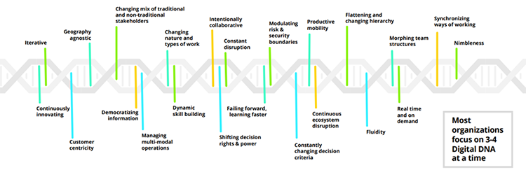 因此,德勤基于大量调研,总结出影响企业数字化转型的23条DNA。这些DNA定义了组织的身份、工作方式和地点、人员、技术、结构、能力、管理方式等。